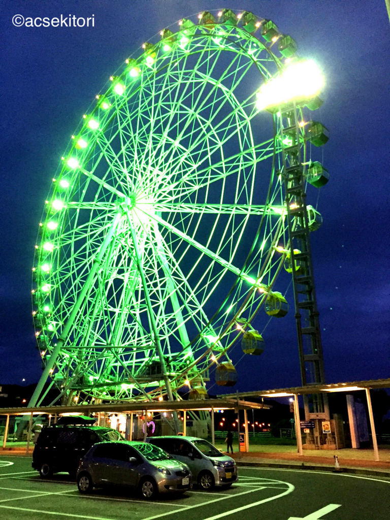 もう一方の車窓です。大観覧車が見えていますね。身障者/お年寄り等用スペースは屋根付きで確保されていますので、私のスペースは一般用です。この観覧車も、まもなくライトアップされるでしょう。